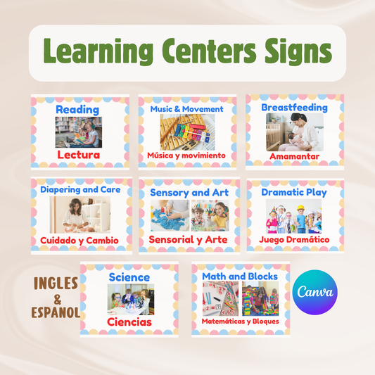 Labels Bilingües Para Áreas de Aprendizaje. Learning Center Sings. Editable en canva. Descarga inmediata.
