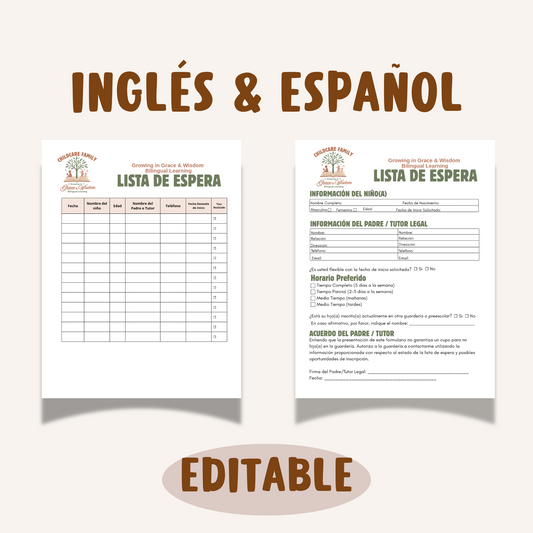 Childcare Wait List Form- Bilingüe- Editable-Descarga Inmediata