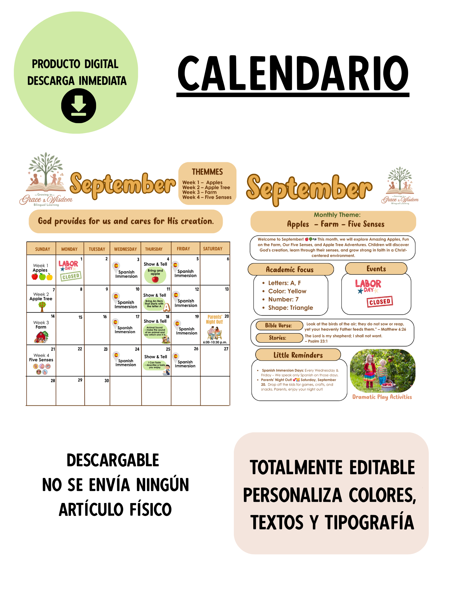 Organiza tu mes de manera práctica y profesional con nuestro Calendario y Boletín Mensual de Septiembre editable, disponible en inglés y español. Ideal para guarderías, escuelas o uso personal, diseñado para que puedas editar directamente en Canva según tus necesidades.